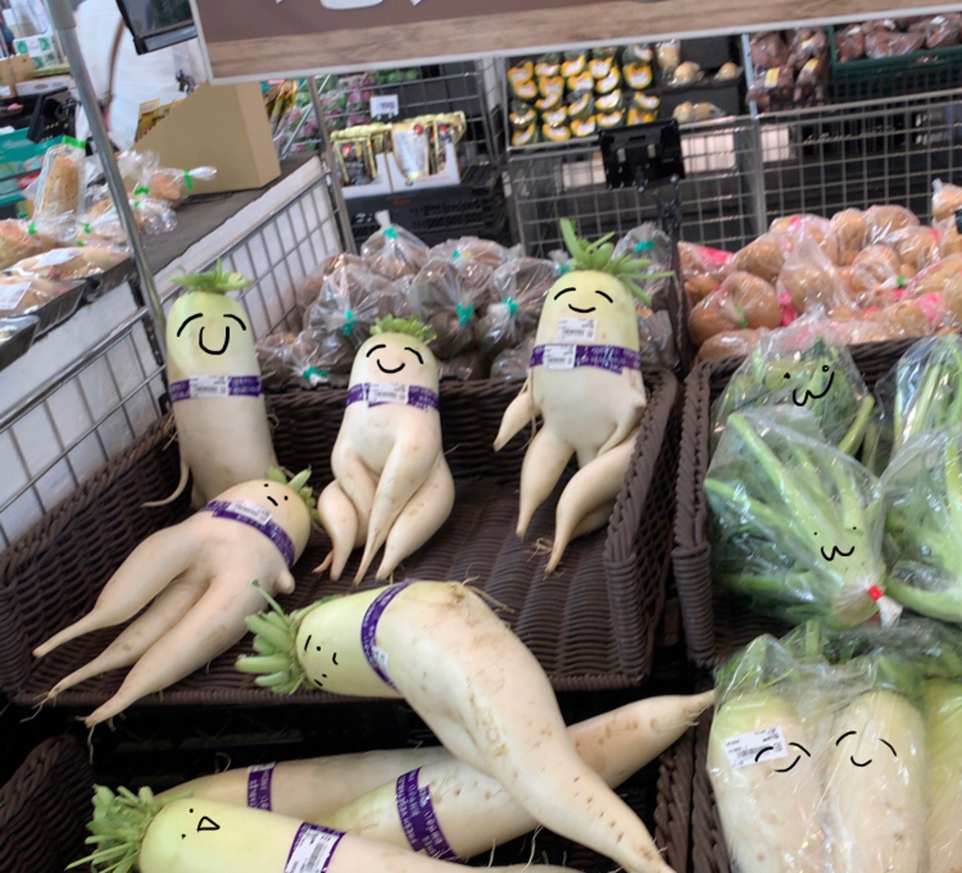 這個「人形蘿蔔」還不只一個,在這位網友的捕捉下,超市裡的白蘿蔔居然真的像是有各種慵懶姿勢!還有網友幫這群「人形蘿蔔」加上五官及表情,使它們更酷似人類大叔正在休息,真的相當搞笑。